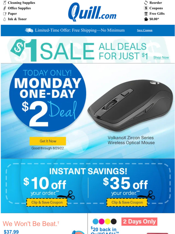 Quill Coupon Codes, Promo Codes, & Discounts | Quill.com 20% back in QuillCASH™ Rewards (for future orders) with $120 on ink & toner Save to Clipboard Code: NT4CSH99 Good through 10/23/22 One-time use per customer. Max $50 in QuillCASH Disclaimer & Details Ink & Toner Offer FREE Mystery Gift with $120 on ink & toner Save to Clipboard Code: NT9GFT24 Good through 10/30/22 5-time use, 5 per order.